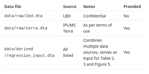 Important: The information should describe ALL data used, regardless of whether they are provided as part of the replication archive or not, and regardless of size or scope.