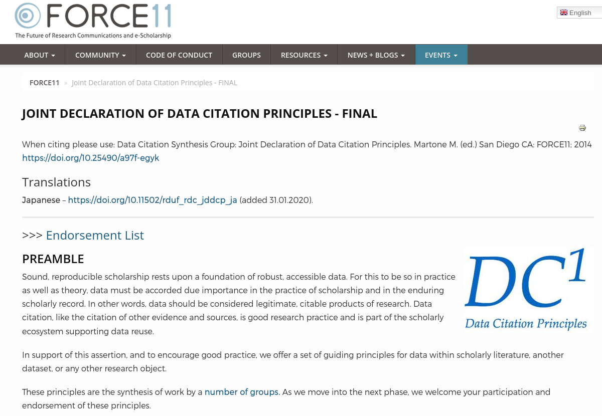 Sound, reproducible scholarship rests upon a foundation of robust, accessible data. For this to be so in practice as well as theory, data must be accorded due importance in the practice of scholarship and in the enduring scholarly record. In other words, data should be considered legitimate, citable products of research. Data citation, like the citation of other evidence and sources, is good research practice and is part of the scholarly ecosystem supporting data reuse.